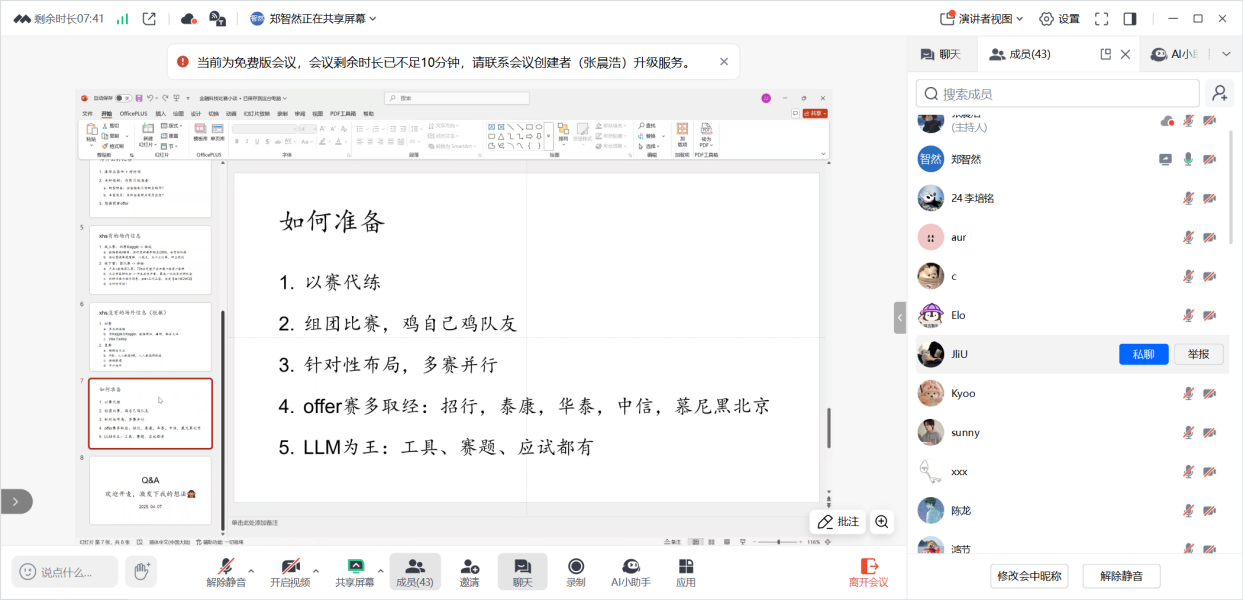 活动伊始,郑智然同学从金融科技赛事介绍、比赛准备与策略、答辩应对这三个方面详细分享了自己参加“招商银行数字金融训练营”的经历。在随后的互动环节中,他细致地解答了同学们关于赛事准备、团队协作建议等方面的问题。
