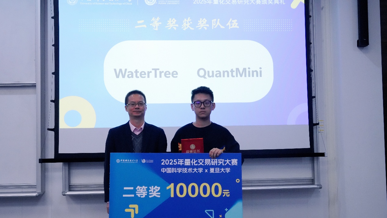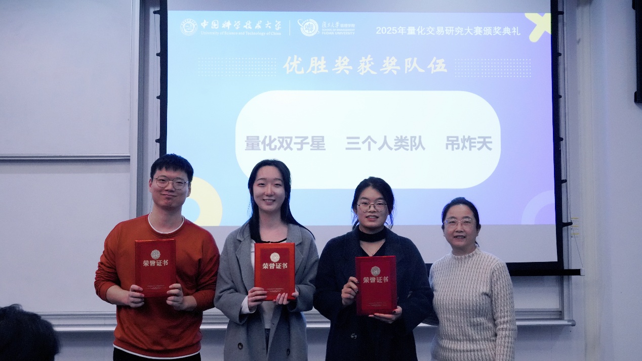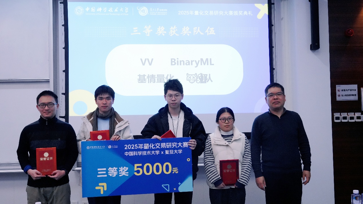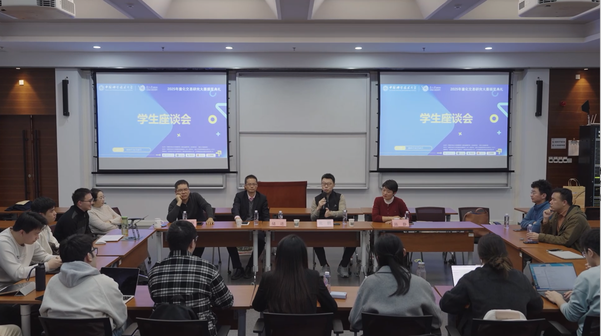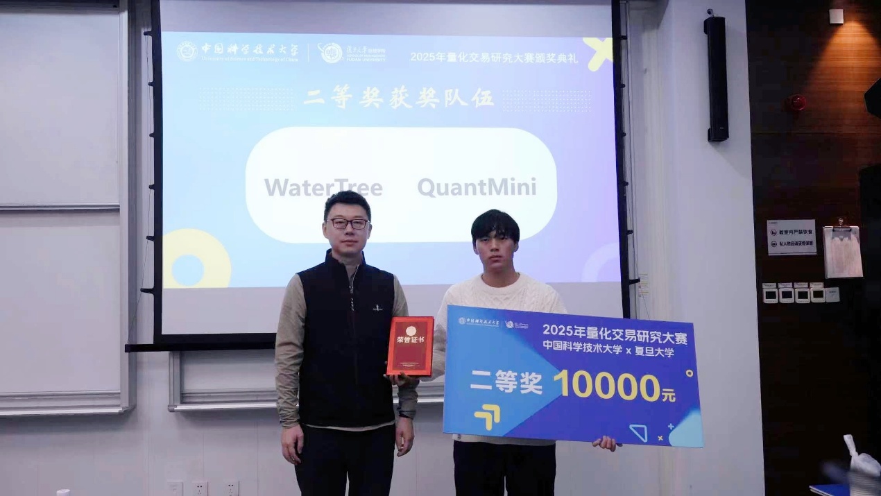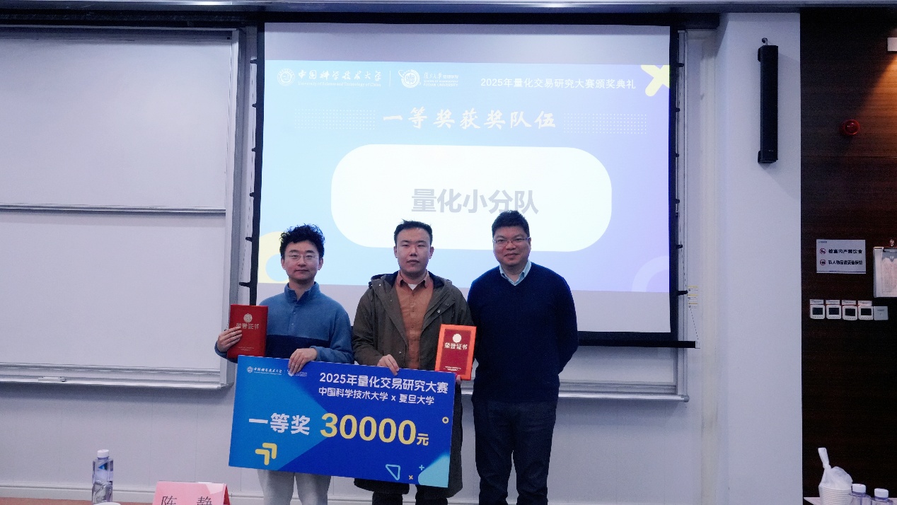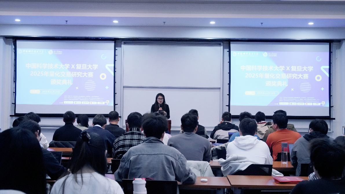 11月19日下午,由中国科学技术大学管理学院与复旦大学管理学院联合主办的2025量化交易研究大赛颁奖典礼,在中国科大国际金融研究院隆重举行。中国科大管理学院副院长吴杰,信弘天禾创始合伙人、MF业界导师张鹏,信弘天禾总经理助理陈静,徽商期货董事长、总经理、MF业界导师储进,徽商期货投教基地运营负责人王威,中国科大管理学院副教授潘婉彬,MF中心主任郭新帅,MF中心副主任李晓燕等嘉宾出席活动。