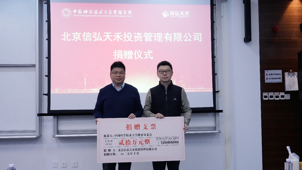 随后,现场举行了北京信弘天禾投资管理有限公司专项捐赠仪式。为支持中国科学技术大学金融人才培养事业,信弘天禾向中国科学技术大学教育基金会捐赠人民币20万元,专项用于管理学院金融学专业本科生教育。仪式上,吴杰副院长代表学院向张鹏先生颁发了捐赠纪念证书,以感谢信弘天禾对学校育人工作的大力支持。