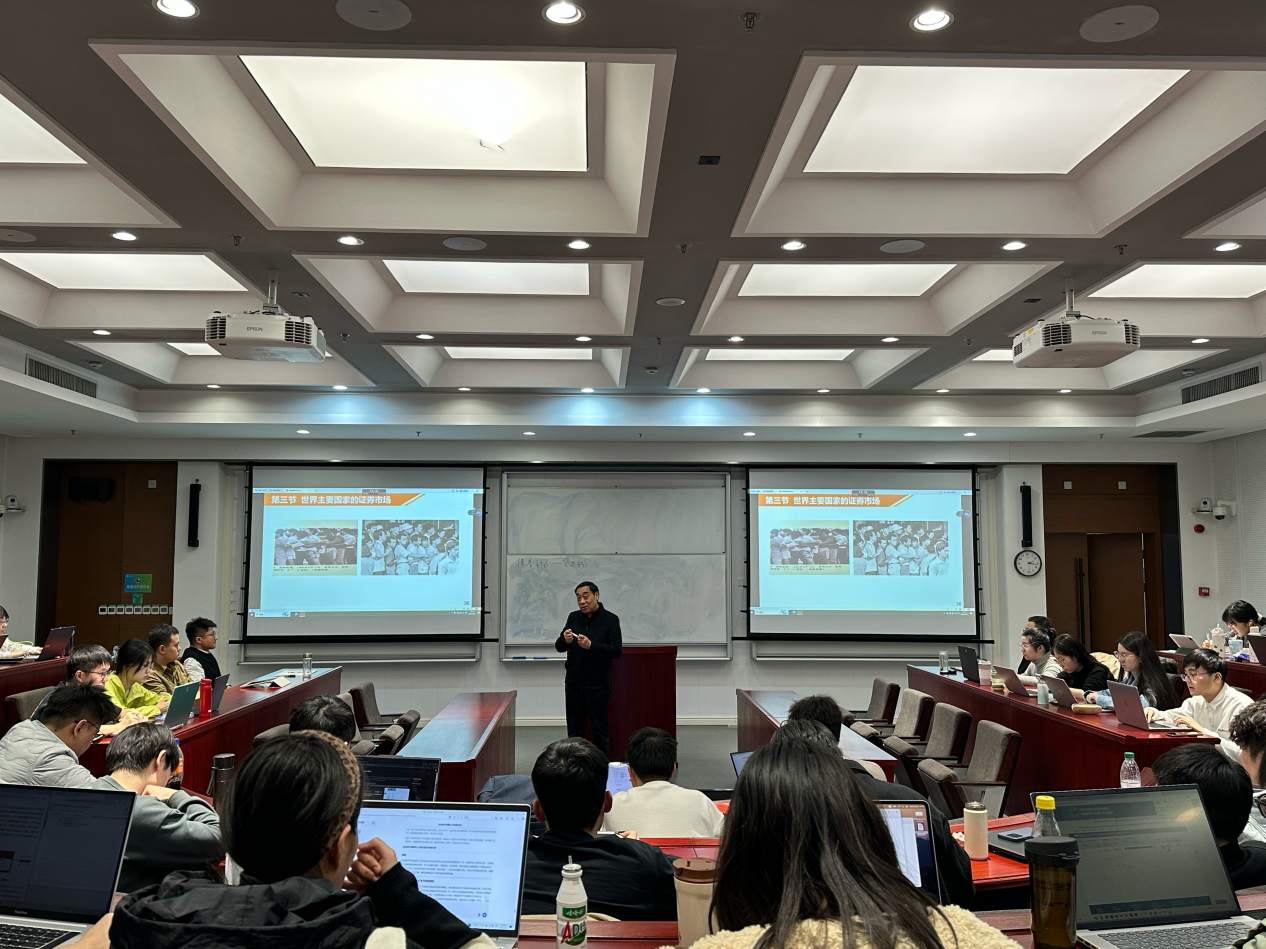随后,时建龙老师系统拆解了证券市场的五大核心功能,包括媒介功能、优化资源配置功能、分散投资风险功能、宏观调控功能以及传递信息功能。为了让同学们更直观、深刻地理解不同国家证券市场的特性,他对中、美、日三国证券市场进行详细对比分析,美国证券市场展现出分散化与专业化并存的显著特点,其市场结构多元且各环节专业度极高;日本证券市场在发行市场的规则设定、融资方式的选择运用等方面,均呈现出别具一格的独特性。尤为值得强调的是,中国证券市场在短短30年间,便完成了西方历经百年的漫长进化历程,在注册制改革、科创板设立、北交所成立等制度创新中实现跨越式发展。