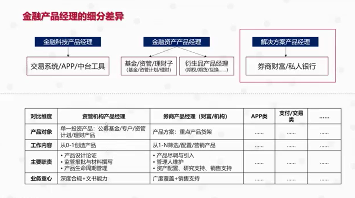 中欧财富产品经理高歌聚焦金融公司中偏互联网类产品经理岗位展开分享。高学姐将该岗位类比为基金公司电商部门,明确其核心是作为平台通过互联网渠道向C端客户销售基金产品,以提升线上获客、交易转化等为目标。