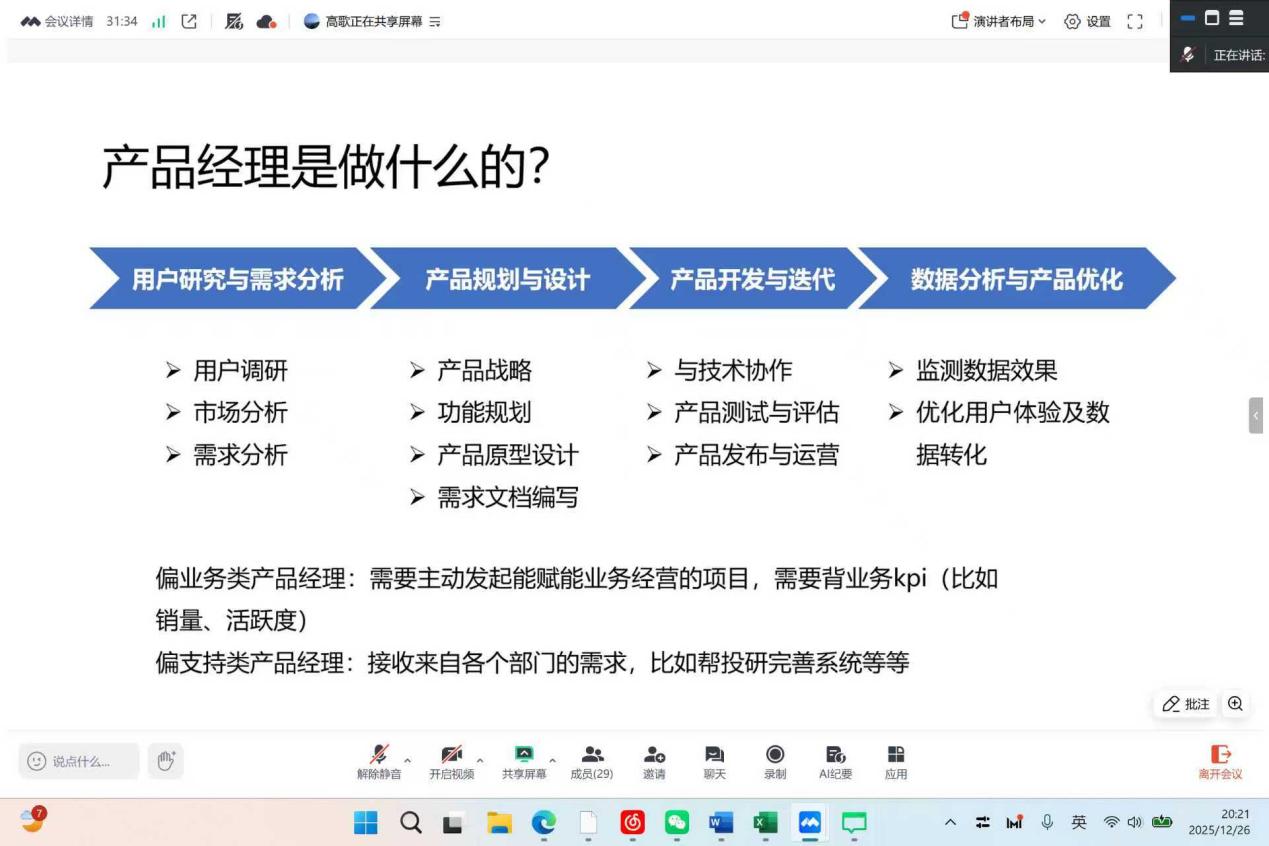 12月26日,由MF学联会职业发展部主办的“金融产品岗位发展攻略”职业发展沙龙在国金院5号楼101教室成功举办。活动旨在帮助同学们深入了解金融产品相关岗位的工作内容与职业发展路径,科学规划职业方向。MF中心特邀光大保德信产品经理汤芮(2018级校友)、中欧财富产品经理高歌(2019级校友)与国金证券产品经理李俊洋(2020级校友)担任分享嘉宾。嘉宾们聚焦领域纵深、能力内核、职业蓝图和焦点对话四大方面,帮助同学们进行金融产品职业路径规划与核心技能构建。