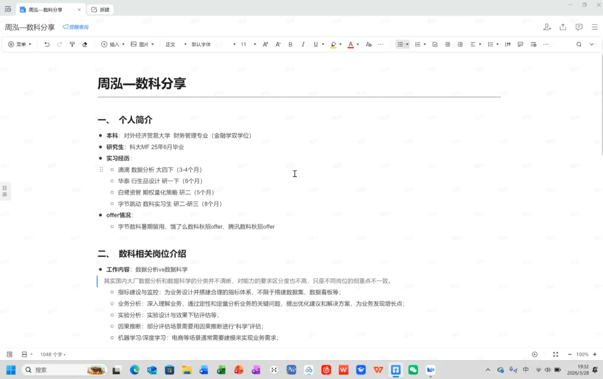 2026年3月28日,由MF学联会职业发展部主办的“互联网赛道破局指南”线上职业发展沙龙顺利举行。本次活动特邀三位来自腾讯、蚂蚁集团、字节跳动的2022级优秀校友担任分享嘉宾,围绕数据科学、信贷风控、商业分析等核心岗位,为同学们带来了一场信息密集、务实有用的职业导航。